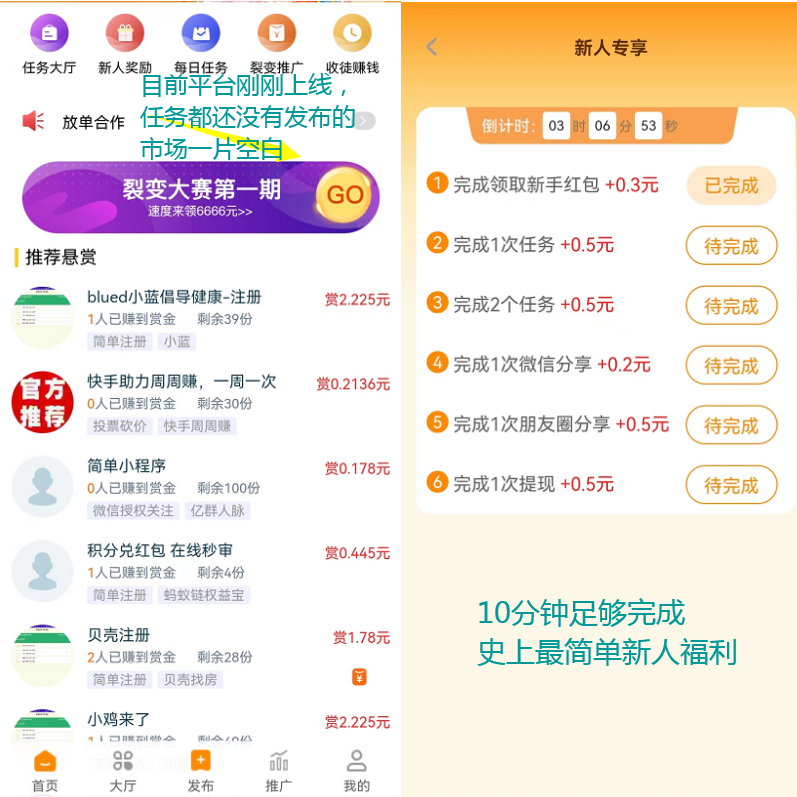 注册平台就直接送0.6元随便弄一下即可提现(满1元就可以提现),继续说回上面提到的新人奖励,这个奖励超简单,实际上就是完成3个任务并且提现加随便分享一下微信朋友圈即可,我们可以选择做最简单的悬赏任务搭配起来,这样可以最短时间甚至十分钟内完成新人任务,拿到额外的2.5元(注意必须完成注册8小时内完成),达成后可以连续小编微信lv100aaa全返新人8元奖励