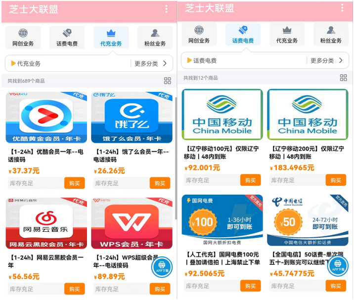 除了虚拟资源课程之外,平台还有电费话费等充值业务最低9折左右,此外还有代充业务,就是比如腾讯会员、QQ超级会员、网易云会员、京东PLUS、饿了么会员等,数百款全网主流软件的会员增值服务,这里基本是5折以下的价格,如果需求大的用户每年光这块就能节省4位数的花销