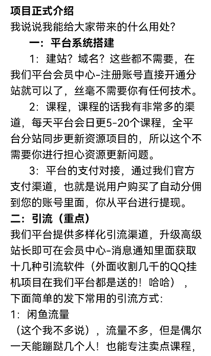 另外我们平台还会赠送独家的引流教程和黑科技软件给各位合伙人,包括合伙人交流学习群,这些都是只有升级之后才会在公告里显示的,可以说只要你开通了就不存在亏本,这么多的引流资源和大咖经验,真不是那些交完钱没有任何服务的平台能比的!平台每天会自动更新发圈文案以及各种收益、提现等素材,助力大家分享用户。