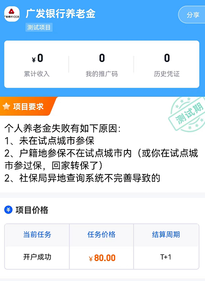 目前,广发银行养老金开户办理的拉新活动,一个人佣金高达80元,应该是所有银行里的佼佼者了!