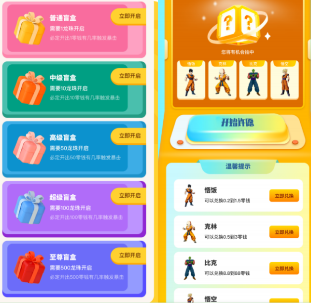 玩法原理非常简单,我们通过游戏升级每天领工资,以及出售装备和转生素材等渠道,可以获得龙珠和龙珠币这种代币,然后通过首页可以龙珠币抽奖根据对应角色拿到分红和直接的现金奖励,龙珠则是开盲盒保底1元而且有几率暴击,而且全民打宝还独家上架了交易板块,后续持续发展理论上是更有优势的。