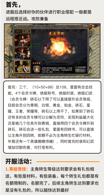 而无论哪个模式赚钱,其实最终都需要我们尽快升级、尽快转生、尽量多打装备;越早冲级,可以预期爆率越高,前期利润就越大;开服前5天所有区服有4倍回收并且额外有冲级奖励!