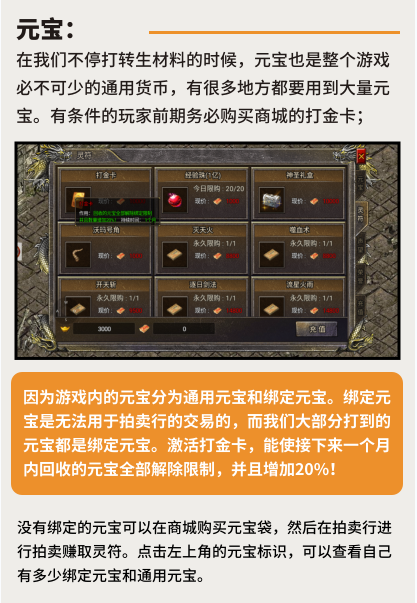 因为游戏内的元宝分为通用元宝和绑定元宝。绑定元宝是无法用于拍卖行的交易的,而我们大部分打到的元宝都是绑定元宝。激活打金卡,能使接下来一个月内回收的元宝全部解除限制,并且增加20%