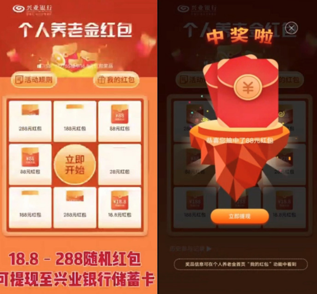 3、兴业银行点击”立即开始“,即可抽奖领取红包(红包可提现至兴业银行储蓄卡)