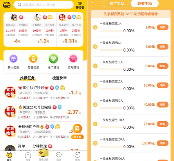 【小编点评】这是一款最新上线的悬赏任务平台,经过一个多月发展已经很成熟,任务类型全,数量多,没有等级限制,可以任意选择。合伙人收益更高,每次好友登陆奖励0.5元,自动发放红包。提现门槛低,2元起提,秒到。