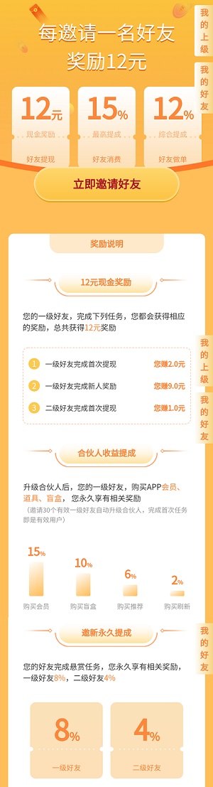 邀请好友做任务还有额外奖励,每位好友可贡献12元以及8%任务提成,徒孙分成4%。