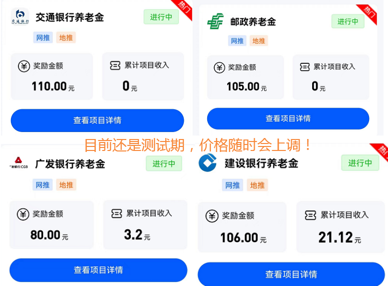 所以这里我推荐注册一个第三方平台【任推邦】,这是一款地推网推拉新平台,里面有大量独家优质推广项目都是正规靠谱的,自然养老金项目是最近的力推,平台实力无疑比我们个人对接要强很多,价格也会有优势,而且平台可以同时对接多个银行的养老金业务,我们可以根据佣金和客户喜好选择相应产品进行推广即可!
