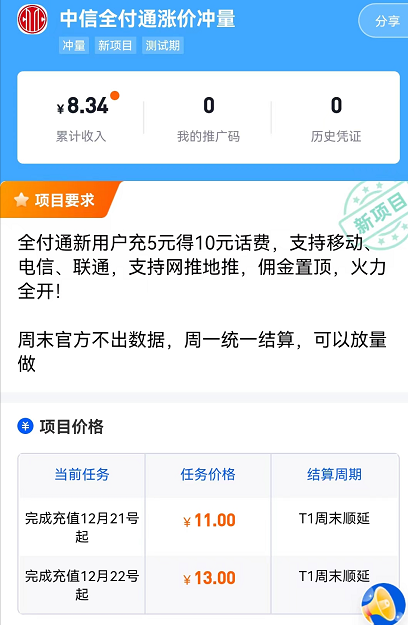 中信全付通项目性价比不错,本身是中信银行旗下出品值得信赖,另外这个软件让别人注册还有5元充值10元的福利,自己能赚佣金,尽管不算非常暴力,但也是一石二鸟了!也可以作为口碑项目,搭配其他任务一并推广拉新!