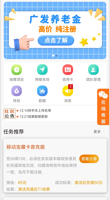 地推伙伴平台任务分为3类有【地推项目】【网推充场】【信用卡】,以目前的情况为例地推项目有4款、网推项目有6款、信用卡项目就比较多;整体来说就是网地推项目合计只有10款,基本就是市场上最基础的几款拉新项目,说实话任务比较少,而且单价也不高,比如快手极速版就只有三十多块。