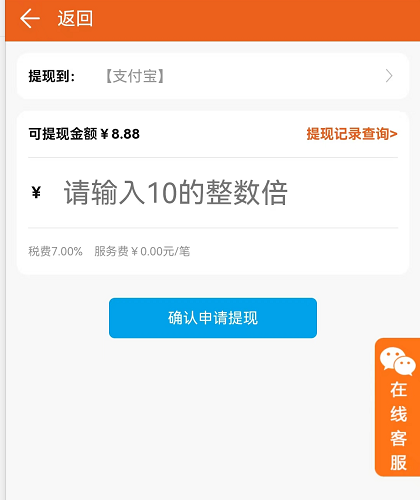 提现方面个人觉得稍差一些,提现门槛10元属于不高不低,注册直接就送你8.88元,第一天做任务薅羊毛是挺好的,不过整体税率(手续费)7%肯定是比较高的,相当于100块钱价格到手实际只有93元,现在市场上比较好的平台都是没有手续费的。