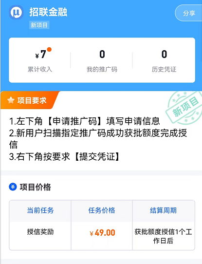 首先注册任推邦,点击【首页】--【金融项目】--【招联金融】任务,申请推广码然后即可开始操作拉新