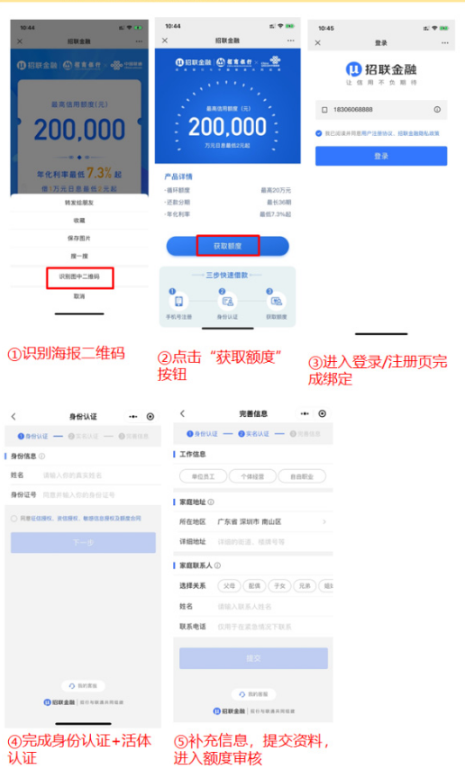 1. 新用户扫描上方推广码,7天内获取授信:【识别二维码】--【点击获取额度按钮】--【进入登录/注册页面完成绑定】--【完成身份认证 活体任务】--【补充信息提交资料,等待额度审核】