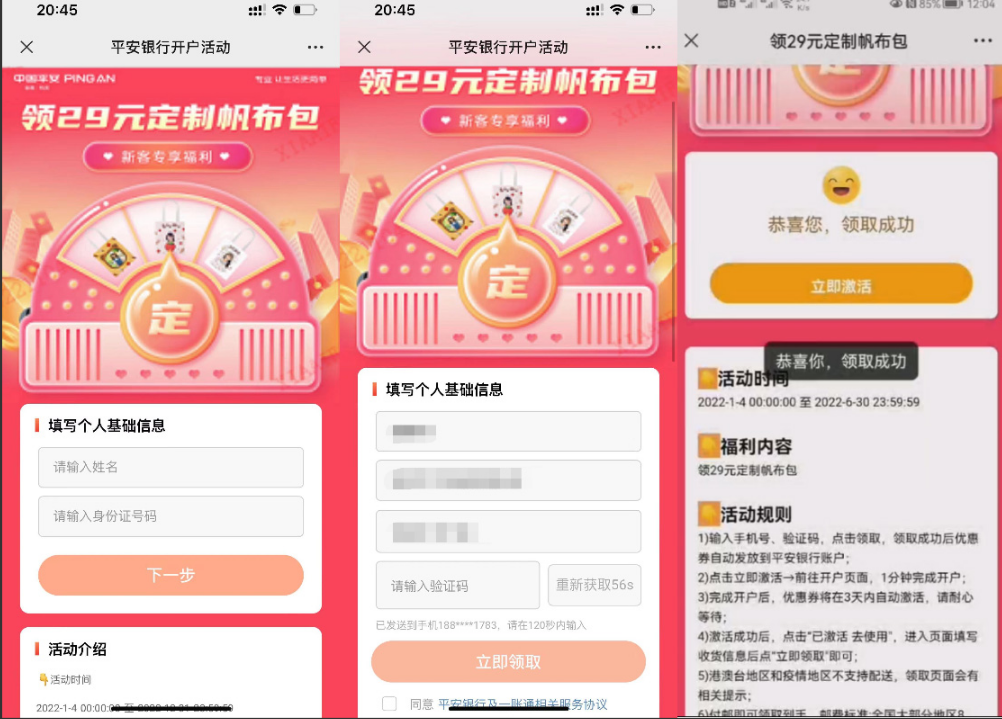 微信扫码输入个人信息领取礼包,立即激活平安口袋银行