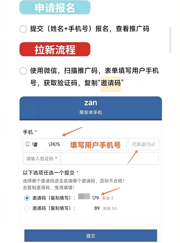 2、使用微信,扫描推广码,表单填写用户手机号,获取验证码,复制“邀请码”