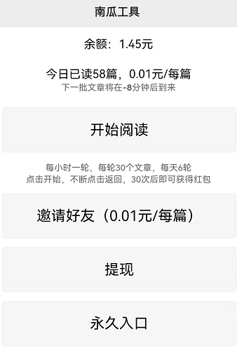 南瓜工具微信阅读赚钱怎么做?去年非常红火的微信阅读项目最近又重新火爆起来了,比如最新上线“南瓜工具”项目就是以前的番茄看看旗下出品,稳定性值得信赖,这种微信阅读项目接近是全自动的,简单粗暴,操作无脑并且可以多个微信一起操作,适合静态单撸也适合工作室批量操作。