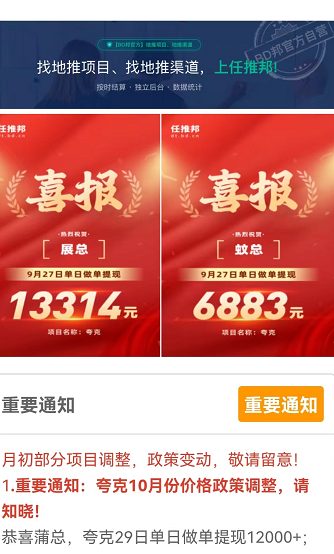 近期的热门优质地推网推拉新任务有哪些?地推网推拉新是挣钱速度最快的正规项目之一,只要执行力足够,每天收益三五百甚至上千元都是再正常不过了,下面从目前最好做的拉新软件--任推邦APP里面分享几款最近特别火爆,无论价格、难度以及性价比来说都是佼佼者,堪称最新风口拉新项目,如果有关注这块的就千万不要错过了!