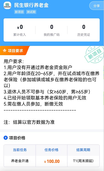 要做民生银行养老金拉新推广就要有对应的后台,首先需要注册【任推邦】,这是全网独家对接的拉新平台(如果找不到这个任务说明下架了,毕竟地推项目有时效性),软件里还有大量独家地推网推任务,建议一起操作收入更高!