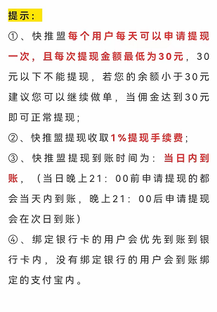 推广跟大部分拉新项目类似,都是无限代抽成模式;提现方面,快推盟提现门槛30元起,说实话门槛是偏高的,现在提现门槛超过10元就不算低了,优质平台甚至可以做到1元起甚至0元起,提现手续费1%不算多,不过也有不少平台是没有任何手续费的