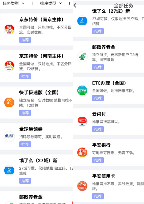 首先如图所示,快推盟是一款专注做大厂甲方拉新的任务平台,不会涉及上述违规项目,而且大家可以仔细看看,目前上架任务包括京东特价版,快手极速版,全球通,饿了么,邮政养老金,ETC,云闪付,平安银行卡这些,很显然都是正规推广项目,所以可以放心操作