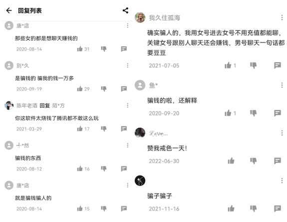 所以某程度上说,爱聊女性用户跟平台其实的同谋,合伙来尽量让男性用户充值现金,然后双方瓜分利润,大家可以试一下让她们加微信,肯定会顾左右而言他,就是各种理由来推脱,因为加上微信就赚不了钱了。