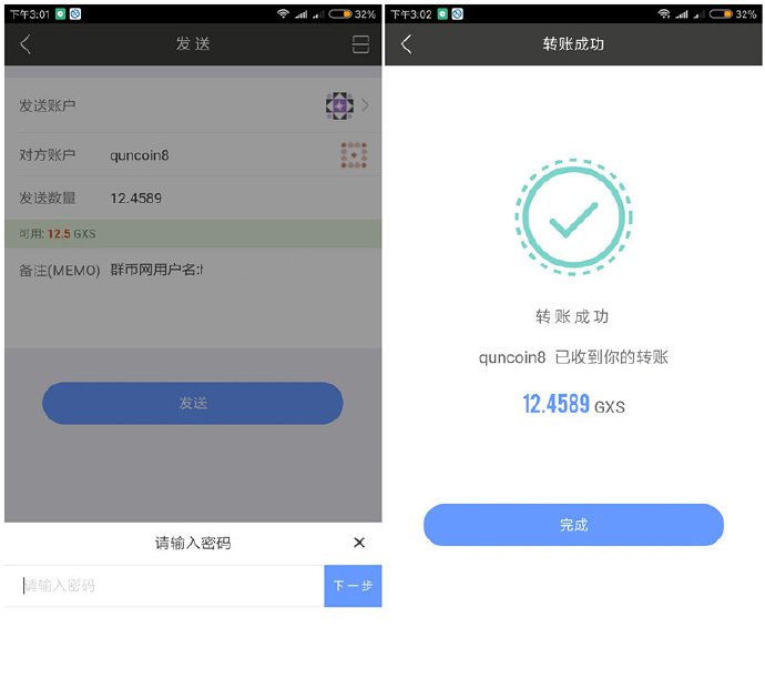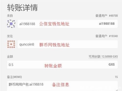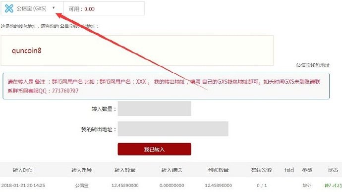 5、转账完成后,返回群币网,在公信宝转入处,填写转入数量,及转出地址(也就是公信宝钱包账号),一般几个小时可以到账,如果长时间不到账,可联系客服处理。