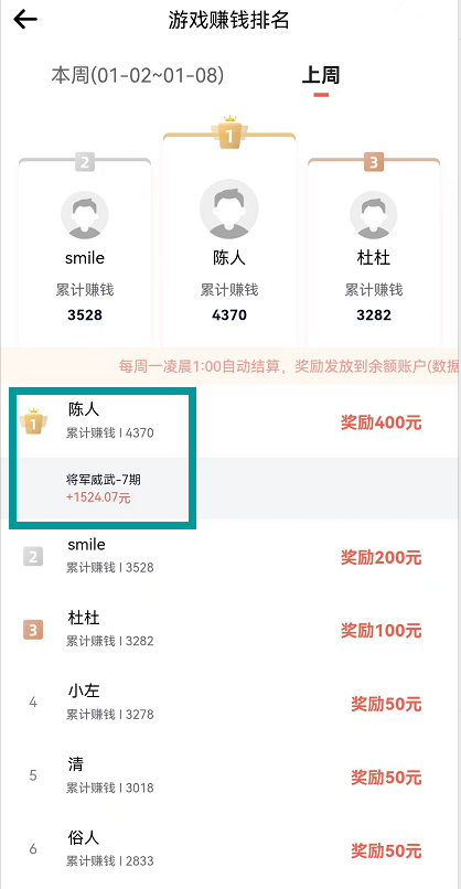 像一些资深的玩家,会多台手机一起操作,数倍放大自己的收益,我们可以看看排行榜,上周前十位基本每周收益几千块,当然这里应该普遍都是有充值的,实际利润没那么高,不过这些人也可能不止一个账号,实际真的有人每周几千元利润!