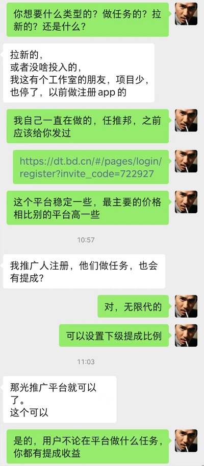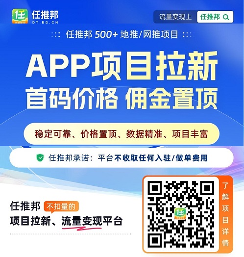 答:任推邦是一个零投资的拉新赚佣平台,平台里边是各种平台方投放的拉新任务,苹果和安卓手机都可以做,推广还有无限代的提成收益。