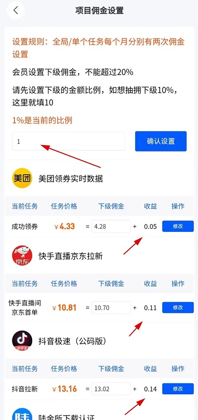 操作步骤:进到任推邦,点击【我的】,【设置抽成】,可以设置抽成比例。流年统一设置的是1%,也就是无限代用户每做成功一单,我就有1%的提成。大家也可以根据自己的需要自由设置。