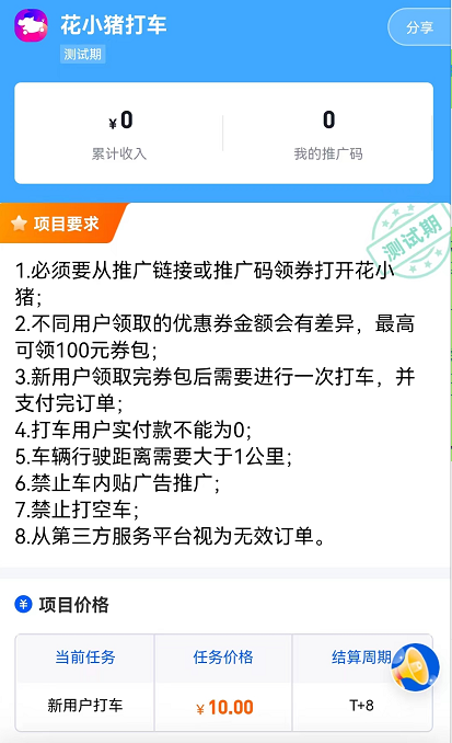 1、任推邦首页找到【花小猪打车】任务主要是乘客版不是司机版,申请报备获取专属推广码