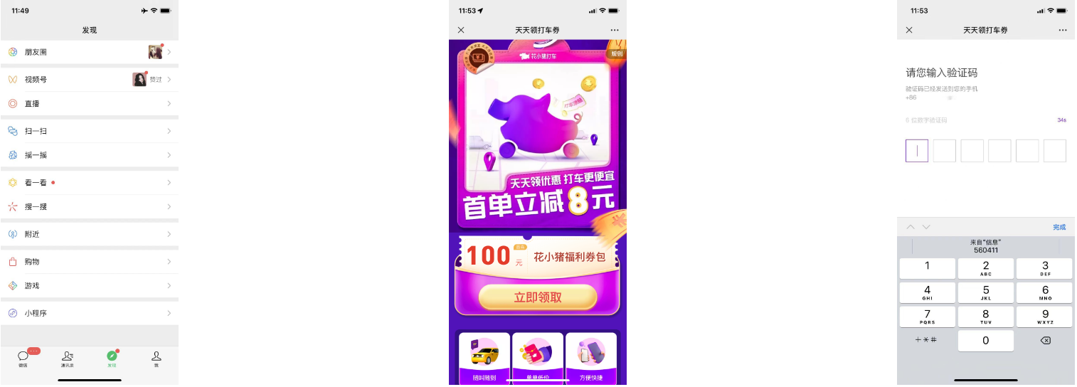 2、用户微信扫描推广二维码,跳转“天天领打车券”,点击“立即领取”领取券包,输入手机号获取验证码登录。