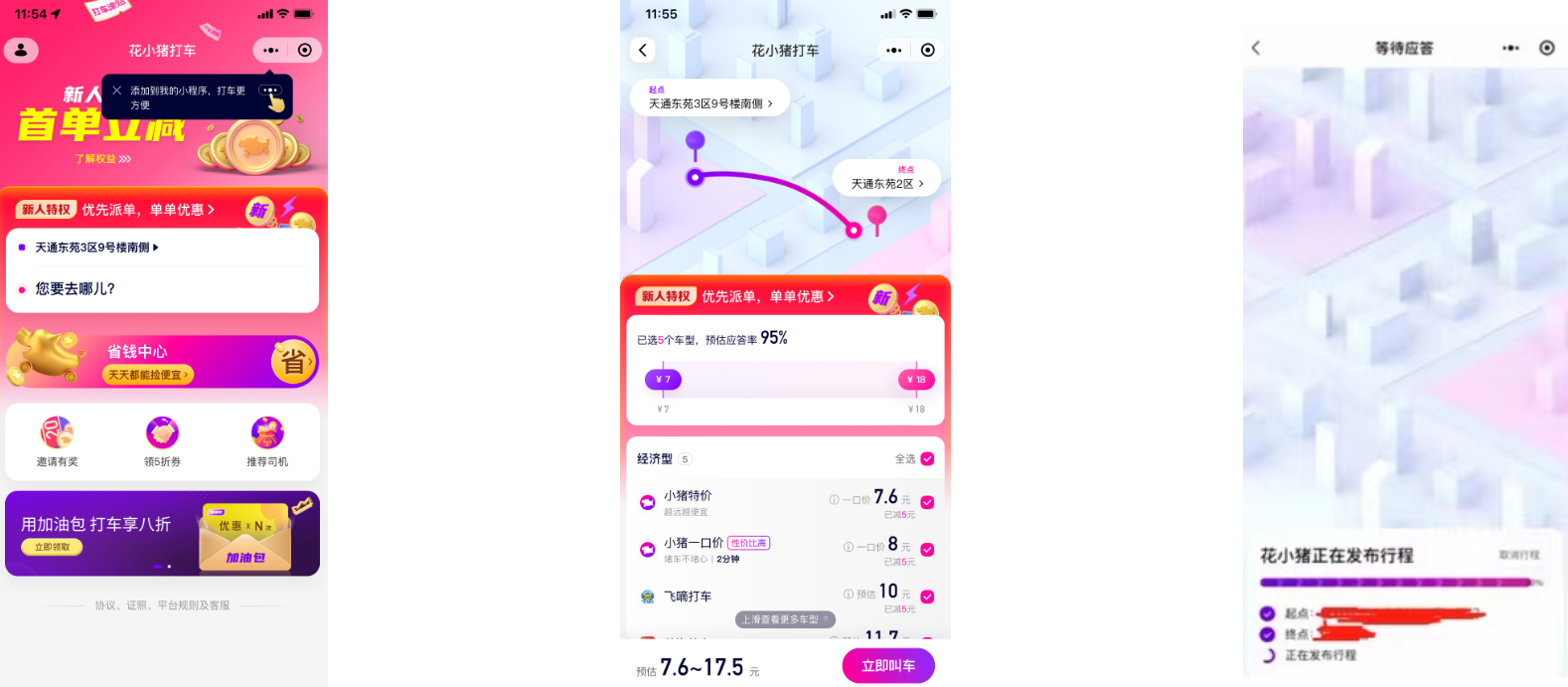 3、登录后显示新用户,点击去使用,跳转花小猪小程序打车页面。
