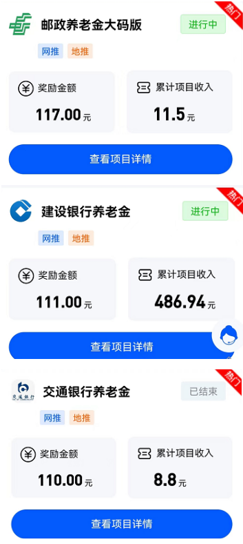 个人建议可以注册一个任推邦APP,这是一款综合性拉新的0投资地推网推任务平台,里面有海量的优质拉新任务,养老金项目自然也是未来的重点业务,平台对接了多家银行的,目前养老金业务都在陆续测试上架,包括兴业、建设银行、广发银行、邮政银行等等都可以同时进行操作,非常全面,除此之外还有很多值得搭配一起做的任务,并且提现0门槛0手续费非常方便!