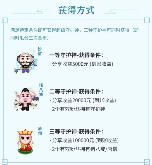 3渠道条件:收益达到100000元,且2个有效粉丝拥有猪八戒或唐僧;