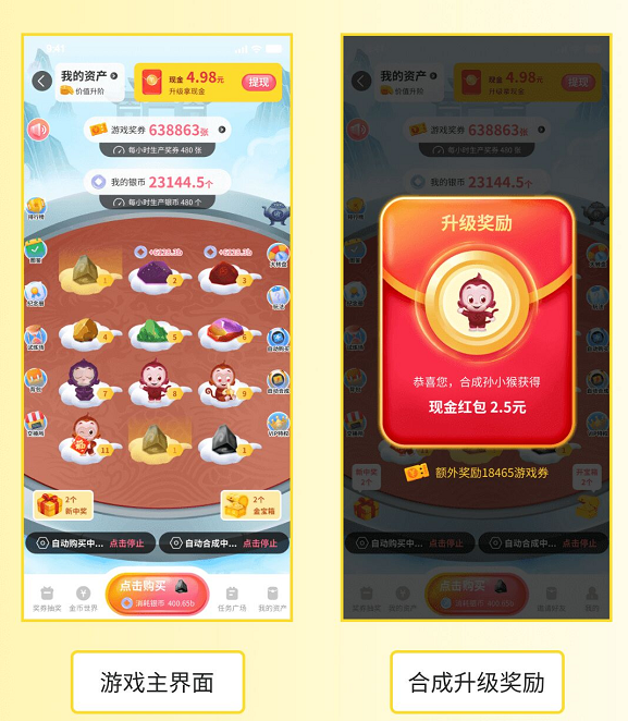1.合成升级游戏,玩合成升级游戏不同级别可获得现金红包和大量游戏券
