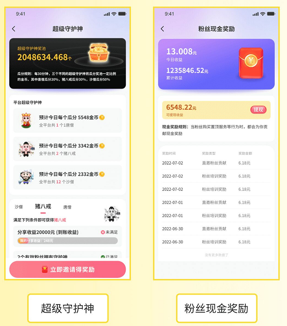 渠道奖励:赠送唐僧,参与大盘分币;获得更高的现金奖励和任务券奖励;粉丝观看广告获得更多广告券和一定现金奖励;
