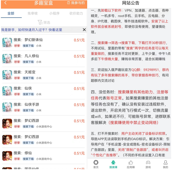 这是一款专门做搜索任务赚钱的APP,就是应用市场输入关键词搜索下载软件,然后打开30秒就能完成任务,主要通过搜索下载优化软件在应用商店的排名,一个任务平均90-120秒佣金0.51,每天理论上日利润能有10