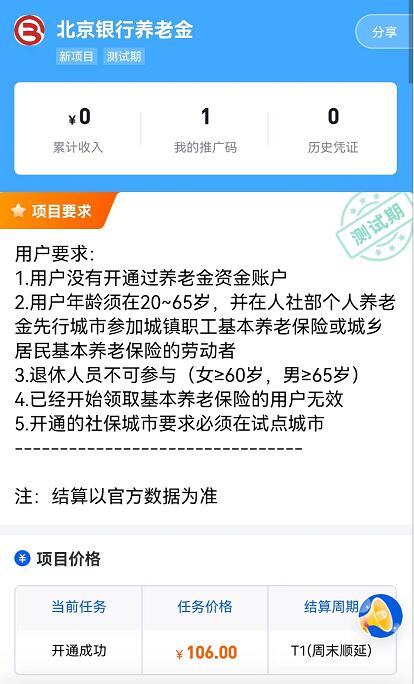 北京银行养老金开户佣金一单多少钱?想必最近很多人应该知道养老金项目是最近地推界的明星级的新秀,前景潜力好,市场空间单,佣金单价高而且流程较为简单,作为全国23家有资质开通养老金账户之一的北京银行,最近也是上线了养老金拉新任务,这里首先说明一下,尽管名字叫北京银行,但是操作客户不限北京也不需要一定有北京银行储蓄卡!