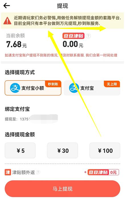 提现说明:豆豆钻不光佣金高,有一些平台佣金看似很高但是各种解锁套路,提现金额门槛、任务数量门槛等等,实际收益远远不如面板数据,而豆豆钻提现没有任何套路,只要余额满5元即可提现秒到支付宝,每天可以提现无数次,哪怕一次1万同样秒到
