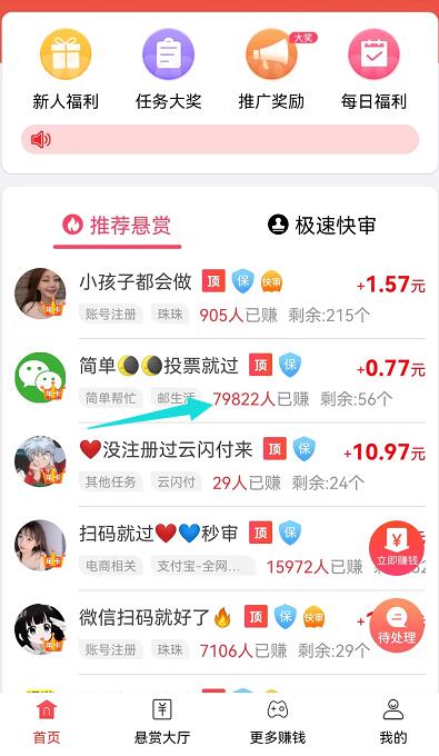 赏帮赚里面也是有游戏试玩的,只不过平台主要赚钱方式是悬赏任务而不是游戏,如果说做任务赚钱,那么赏帮赚就是龙头项目,整个软件上万款软件,下载、注册、认证、助力等等根本做不完,执行力强的每天能有几十员利润,满1元即可提现秒到!