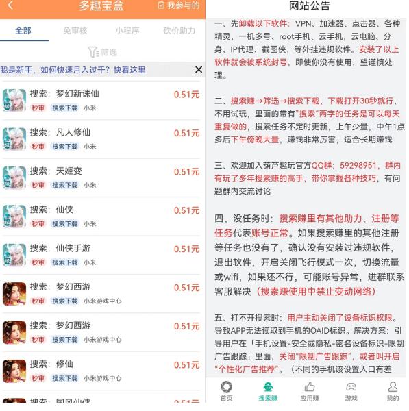 同一个任务自然单价越高越划算,其中豆豆钻主打的是游戏试玩板块,所以在搜索赚这方面价格就逊色一点,佣金价格是0.45元每单;而葫芦趣玩价格是0.48元;多趣宝盒价格最高是0.51元。