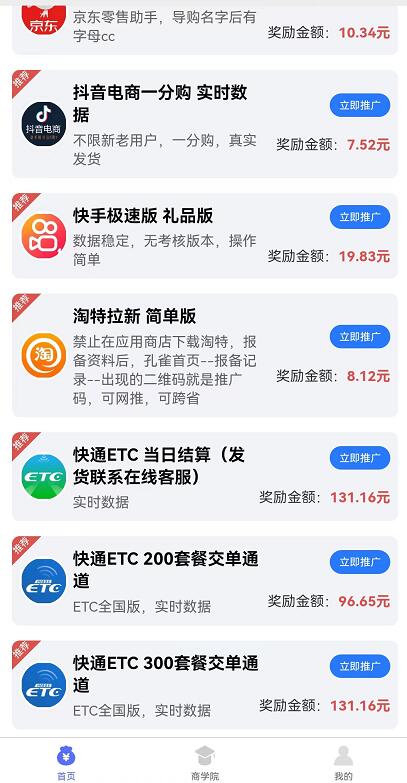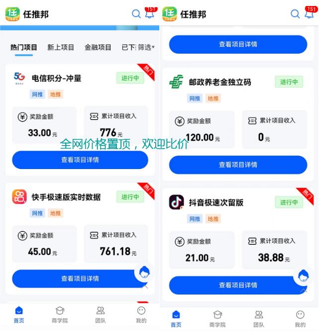 首先任务丰富,任推邦目前三大板块【热门项目】【新上项目】【金融任务】合计一共有数十个任务,日常经常都新上独家任务,所以选择和优质项目要多很多!