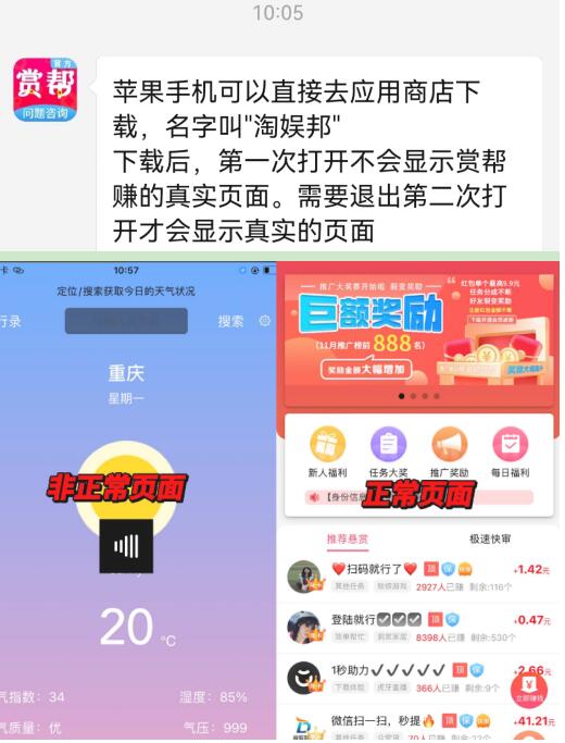 淘娱邦APP是不是诈骗?其实有接触过网络赚钱的朋友就自然清楚这款软件安全可靠,其实淘娱邦就是赏帮赚的苹果版本,赏帮赚已经上线1年多用户量有数百万,不需要投资一分钱,而且提现门槛低至1元秒到,所以完全是安全可靠值得信赖的!