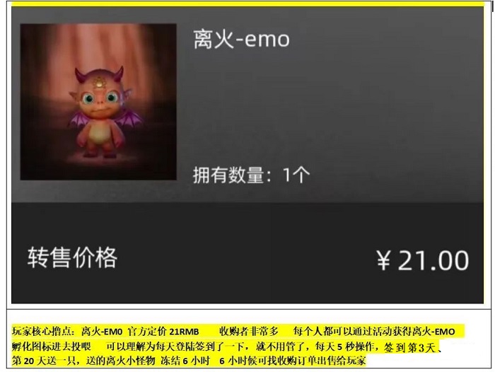 当新手玩家投喂三天得到Emo,Emo被系统冻结6小时,冻结期间玩家不可把Emo出售,6小时结束冻结可出售。