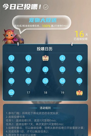 活动期投喂日历,针对所有注册用户开放活动,不可断签到,每个玩家只有一次完整参与机会,全程参与可获得两只EMO。