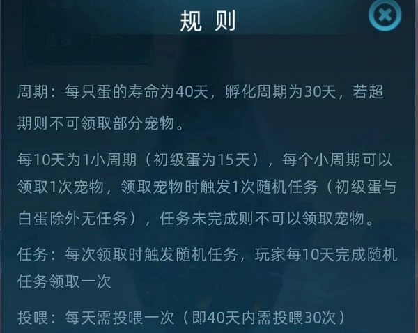 宠物蛋规则:宠物蛋有寿命,有多个蛋的时候喂养孵化一定要及时激活其他的宠物蛋,再去一键喂养,不然个别蛋要多喂补喂。