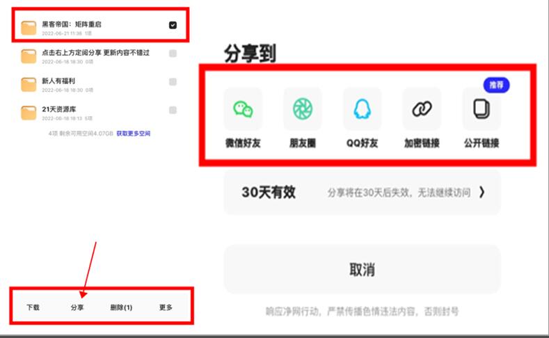 (2)找到要分享的资源,长按,点击下方的分享,选择最后一个【公开链接】;