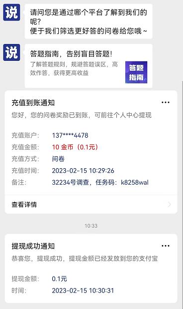 不过幸亏【调研说】即便打错了也有补偿,比如小编一开始就打错了,好歹有0.1元补偿虽然不多,但是小编刚注册其实就做了2个选择就有钱,还是不错的补偿了,并且0.1元已经可以提现,亲测5分钟内就到账了
