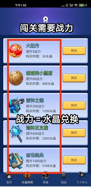 2:可以利用水晶提升战力,战力越高爬塔越高。