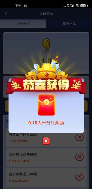 1:通过每日签到、广告、悬赏、试玩等玩法获取水晶购买道具挑战关卡得到金矿。金矿产出现金分红。