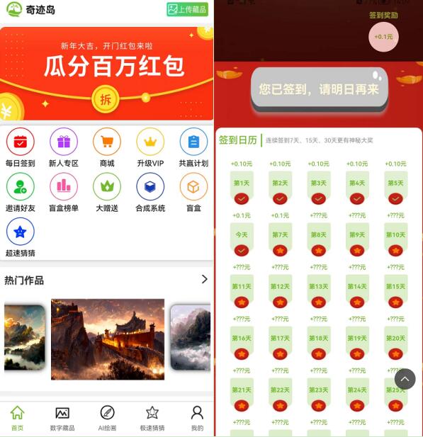 奇迹岛是一款数字藏品软件,去年应该很多人都知道这类APP还是比较火爆的(原创内容,严禁搬运),这种项目是否靠谱见仁见智,玩法不同收获自然不一样,不过恰好可以满足某些网友说的签到挣钱的要求